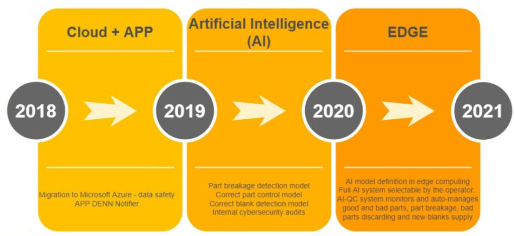 DENN metal spinning and flow forming machinery represents the optimal solution for intelligent work (Industry 4.0). This big data collection and analytics, sensors,, predictive maintenance, production data quality control, networking,, virtual training, process optimization, monitoring, automation, system integration simulation, cloud services, and Apps. DENN is at the forefront of transformative technology within the Industrial Internet of Things (IIoT).