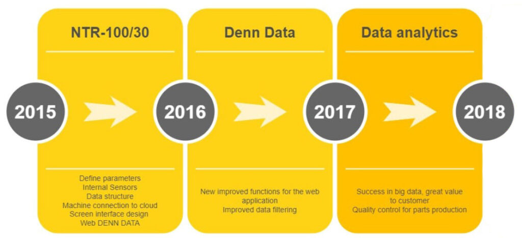 Welcome to DENN data, the cloud service to boost your metalforming projects. Improve your productivity by using cloud monitoring. DENN data calculates productivity and helps to improve metalforming processes. To be updated has never been easier: Alarms, Forces (Traces), Energy Consumption and more are automatically and seamlessly analyzed. Export process data. Proactive maintenance; sensors are installed in the machines to warn about potential or upcoming problems.