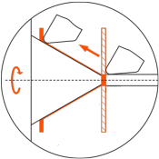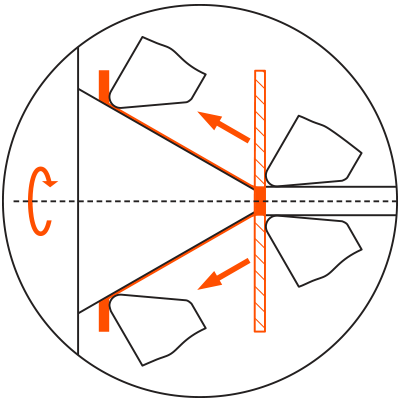 Shear forming, also referred to as conical flow forming (concave and convex flow forming) or shear spinning, is an incremental metal forming process similar to metal spinning. But in shear forming, the diameter of the final piece is approximately equal to that of the original flat sheet metal blank. In opposite, the wall thickness follows the rule hereafter and a reduction of the wall thickness occurs, which is linked to the angle ß of the final part.